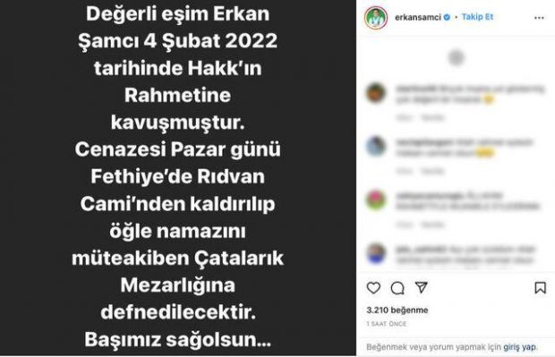 “Değerli eşim Erkan Şamcı, 4 Şubat 2022 tarihinde Hakk’ın Rahmetine kavuşmuştur. Cenazesi Pazar günü Fethiye’de Rıdvan Cami’nden kaldırılıp öğle namazını müteakiben Çatalarık Mezarlığına defnedilecektir. Başımız sağ olsun…”