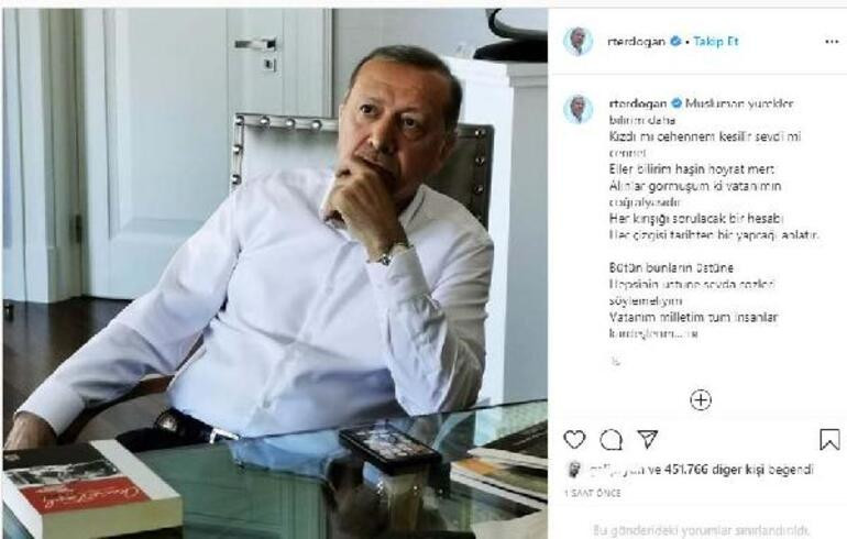 Erdoğan'ın paylaşımdaki dizeler ise, "Müslüman yürekler bilirim daha, Kızdı mı cehennem kesilir sevdi mi cennet, Eller bilirim haşin hoyrat mert, Alınlar görmüşüm ki vatanımın coğrafyasıdır. Her kırışığı sorulacak bir hesabı, Her çizgisi tarihten bir yaprağı anlatır. Bütün bunların üstüne hepsinin üstüne sevda sözleri söylemeliyim. Vatanım milletim tüm insanlar kardeşlerim" oldu.