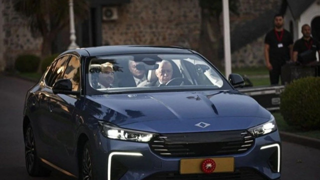 Cumhurbaşkanı Erdoğan, plakasına Cumhurbaşkanlığı forsu takılan Togg'un mavi renkli yeni modeliyle test sürüşü yaparken, araç hakkında bilgi aldı.